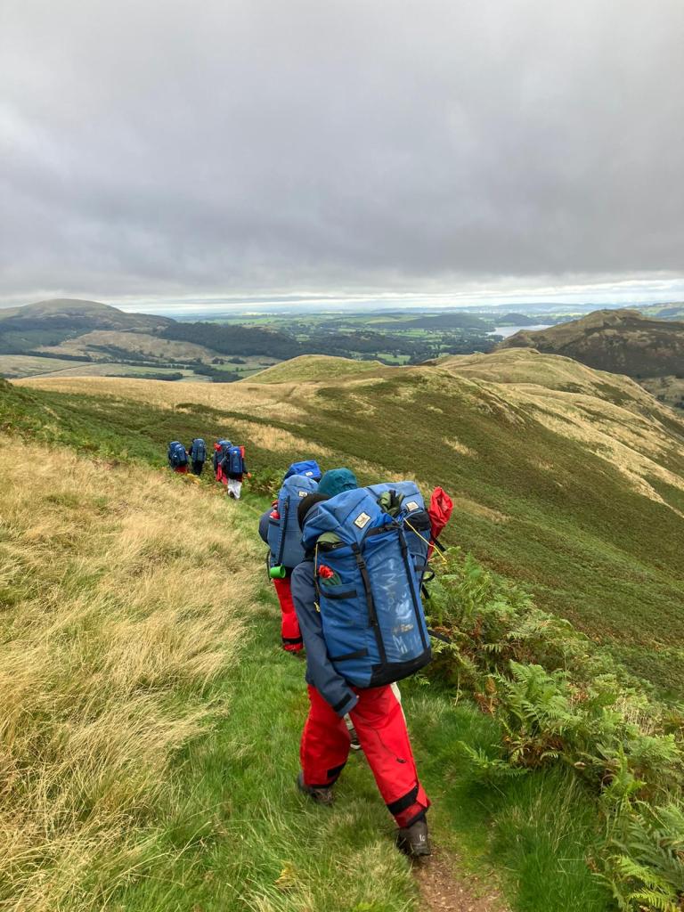 Our team took a minibus to the start of our expedition, loaded up with 12 willing explorers (including Claire) heavily laden with fully-packed rucksacks! The walk meandered up a woodland track at first, followed by a steep climb up to our campsite at Glenridding Dodd. Our team handled the climb with ease, surprising ourselves with our resilience and camaraderie! We set up camp with minimal fuss and cooked our supper in the wild before an evening climb up to Sheffield Pike.